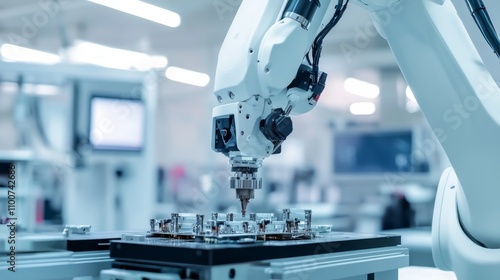 A high-tech robotic arm conducting precise automated assembly of high-performance gaming hardware in a clean, modern gaming lab, innovative and sleek environment with a focus on gaming technology