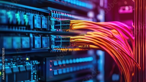 A high-tech server rack with network cables in distinct colors neatly connected to a switch panel, offering a clear and efficient data network setup