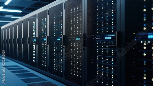 A high-tech server room filled with rows of data storage units, illuminated by LED lights, representing advanced computing infrastructure.
