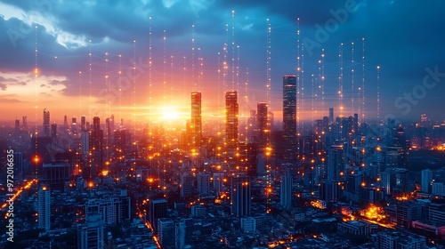 A high-tech skyline with interconnected high-rises, where glowing data streams symbolizing cloud networks and wireless communication link every building.
