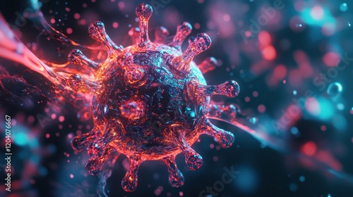 a high-tech virus design with translucent layers and neon lights, dynamic holographic elements, close up, focus on, copy space