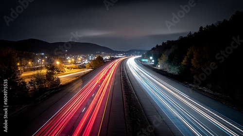 A highway at night with long exposure light trails, creating a vibrant and dynamic feel as cars zoom by.