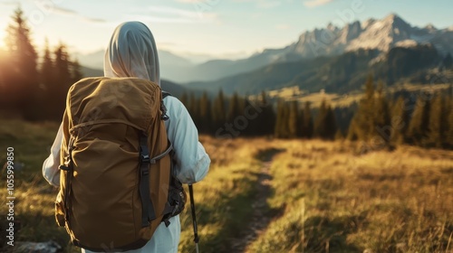 A hiker, equipped with a large backpack, stands on a mountain path, gazing towards a vibrant sunrise, symbolizing new beginnings, adventure, and inner peace.