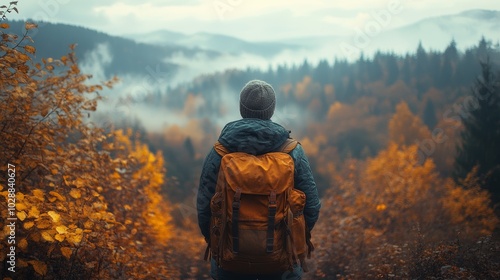 A hiker stands on a mountain trail, gazing at a misty autumn forest with vibrant foliage, capturing a moment of adventure and nature's beauty.