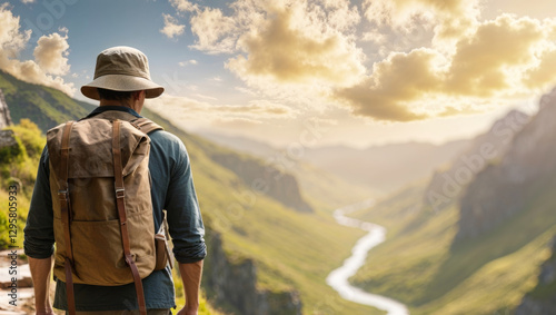 A hiker with a backpack enjoys the panoramic view of a green valley and distant mountains.