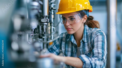 A Hispanic female mechanical engineer wearing a safety helmet working on a complex machine industrial background determined expression