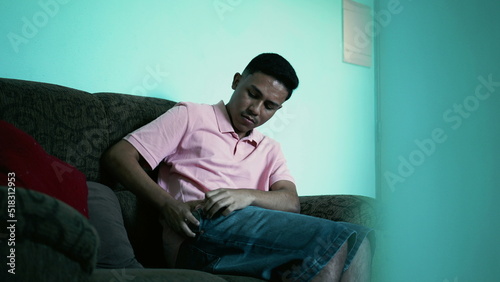A hispanic man putting smartphone inside pocket pants. Latin person puts phone away