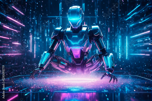 A holographic A futuristic scene with a high-tech robot electric battery, made up of many particles. Generative AI.