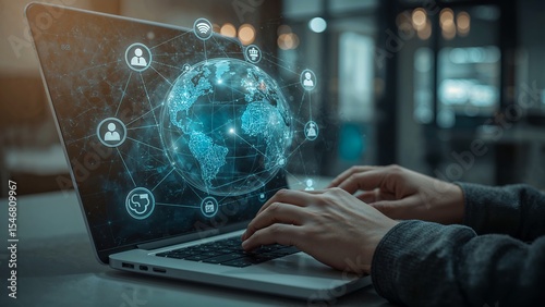 A holographic AI interface with global and network icons emerges from the laptop. Hands type on the keyboard,