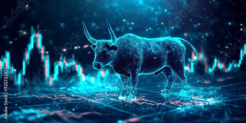A holographic bull against a background of glowing stock market charts, indicating a bullish trend.