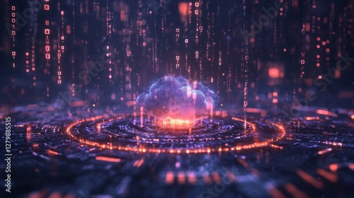 A holographic cloud integrated with a microchip on a dark background, surrounded by binary codes