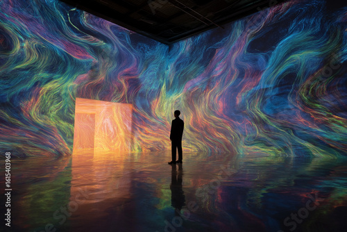 A holographic interface set in a crystal room with swirling colors and interactive projections