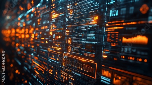 A holographic interface showcases various data analytics and metrics, allowing users to manage multiple datasets seamlessly in a futuristic setting.