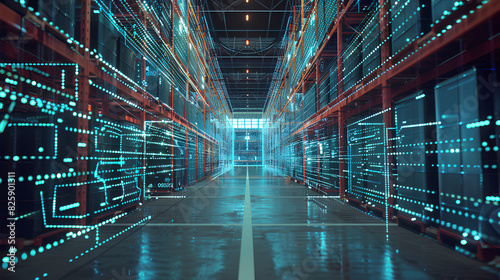 A holographic projection of a supply chain network diagram in a logistics center, business, dynamic and dramatic compositions, with copy space