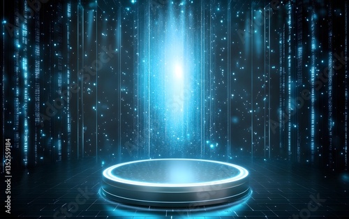 A holographic, shimmering podium with a prism effect, placed in a futuristic virtual reality environment