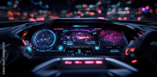 A holographic touch interface on a futuristic vehicle dashboard, showcasing real-time navigation and system status.