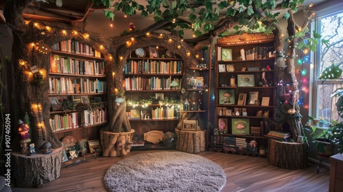 A home library with a whimsical, enchanted forest theme, featuring fairy lights, tree trunk shelves, and magical decor.