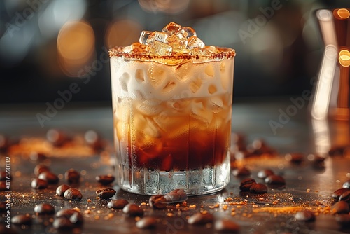 A horizontal image of a white russian cocktail in rocks glass in a bar