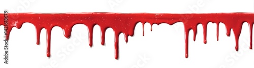 A horizontal line of red paint dripping down on a white background, front view, hyperrealistic.