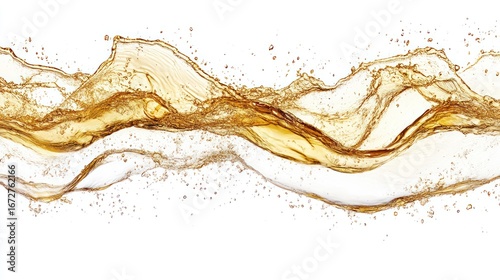 A horizontal splash of golden liquid, creating dynamic waves and droplets against a clean white background.