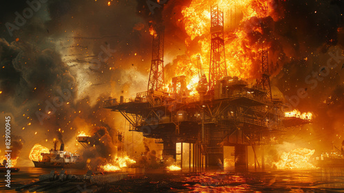 A horrific scene with explosions and fire. An oil rig, bursting with oil, people running for thier livesfireworks.generative ai