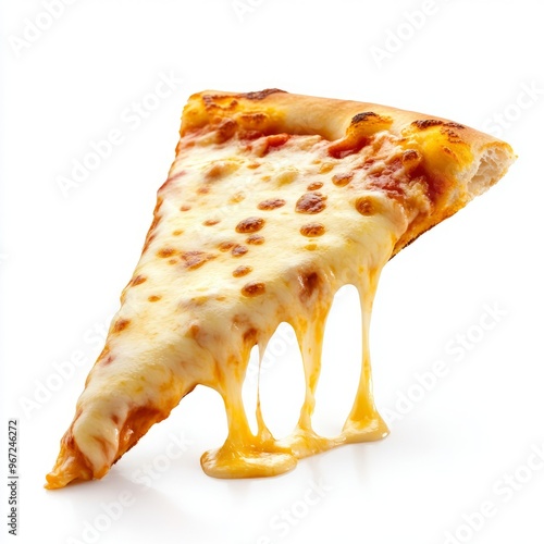 A hot pizza slice with dripping melted cheese. isolated on white background.