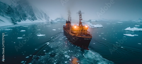 A huge ship sails on the ocean in winter. Melting glaciers.