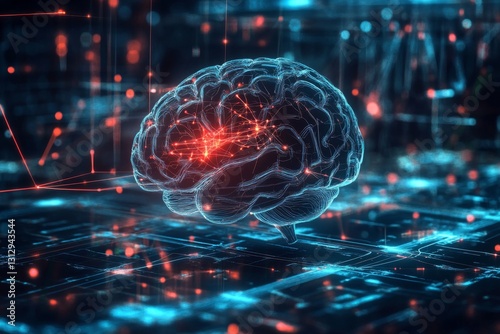 A human brain is visualized in a digital landscape, showcasing intricate neural connections and sparks of activity in a futuristic setting