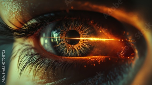 A human eye with a laser beam passing through the pupil, symbolizing focus and technological innovation. Ideal for science fiction, medical, and tech visuals.