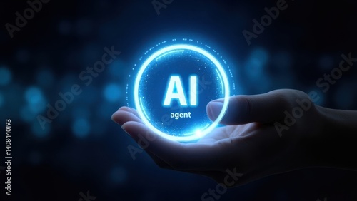 A human hand delicately holds a glowing circular object with “AI agent” inscribed inside. Against a dark background with soft, blurred lights, the image evokes futuristic innovation and technological