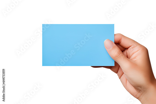 A human hand holding a blank sheet of blue paper or card isolated on white background