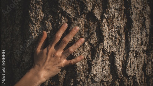 A human hand rests gently on the rough, textured bark of a tree trunk, symbolizing a connection with nature.