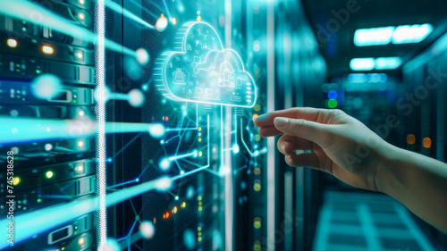 A human hand touches the icon of cloud computing, merging the human touch with powerful technology and connectivity in the digital realm.