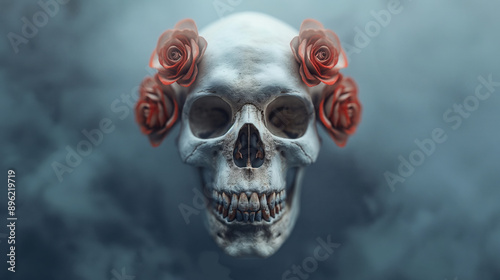 A human skull with red roses placed symmetrically on either side in a foggy, dark background.