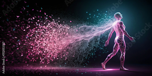 A human-like figure is walking forward while breaking apart into colorful particles. The scene is illuminated with vibrant hues of pink and blue, creating a sense of transformation