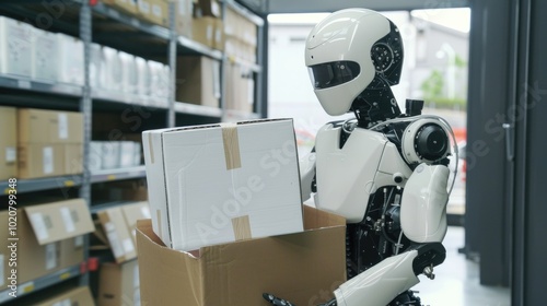 A humanoid robot carefully handling a package in a modern industrial or warehouse environment, illustrating advancements in robotics and automation for logistics and manufacturing