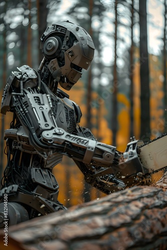 A humanoid robot lumberjack cuts a log with a chainsaw
