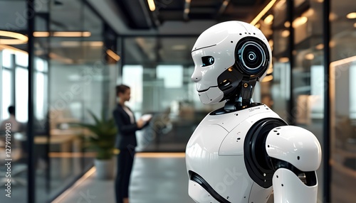A humanoid robot stands in a sleek office environment, surrounded by contemporary furniture.