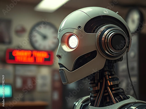 A humanoid robot with an empty, expressionless look stands against a futuristic background filled with cold lights and sleek, high-tech structures