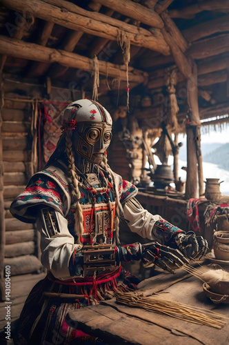 A humanoid robot with intricate golden and silver