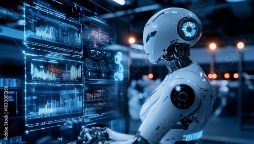 A humanoid robot works on a computer screen with data visualizations and graphs in a modern, futuristic factory.
