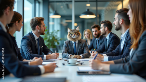 A humorous business meeting with a cat dressed professionally sitting at the table among humans.