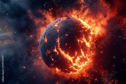 A hyperrealistic cosmic catastrophe unfolds as a colossal gas giant collapses, its molten core erupting in a superheated explosion. Shattered fragments of its icy rings scatter into the deep space voi