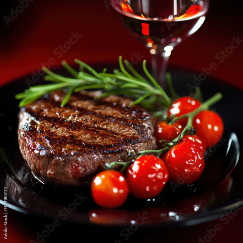 A hyper-realistic, highly detailed photograph of a perfectly grilled steak on a black plate
