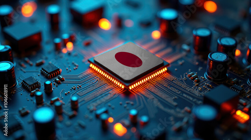 A Japan flagged microchip is centered on a circuit board, surrounded by illuminated components, symbolizing role in semiconductor innovation and technology leadership.