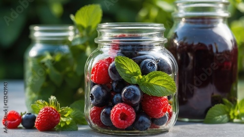 A jar filled with mixed berries and mint, with additional jars in the background.