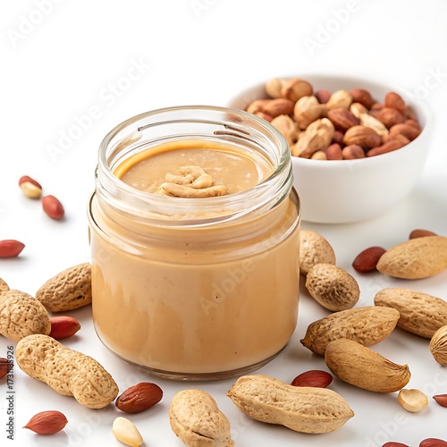 A jar of creamy peanut butter sits among scattered peanuts and a bowl of peanuts, isolated on white background, offering a delicious and nutritious snack option