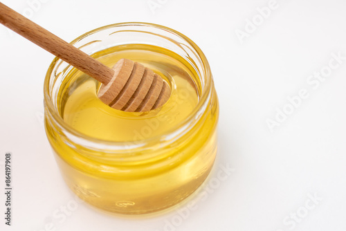 A jar of honey with a wooden dipper, essential for serving sweet treats