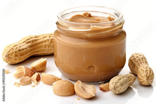 A jar of peanut butter sits on a table with a few peanuts scattered around it. The jar is half full, and the peanuts are spread out in various sizes and shapes. Concept of indulgence and comfort