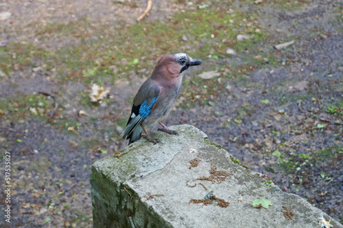 A jay bird with blue, white and brown feathers sits on a stone in a park on a spring day